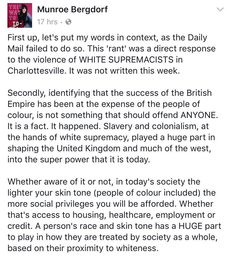 Munroe Bergdorf took to Facebook to defend her rant against “White Supremacy.”