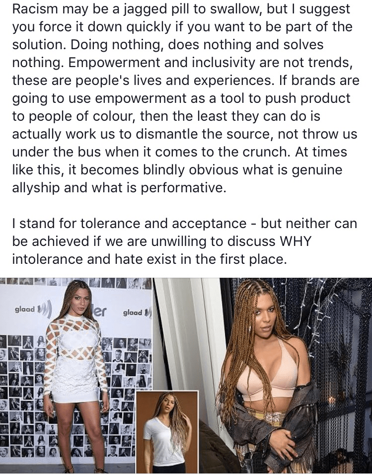 ‘Because most of ya’ll don’t even realise or refuse to acknowledge that your existence, privilege and success as a race is built on the backs, blood and death of people of colour. Your entire existence is drenched in racism. From micro-aggressions to terrorism, you guys built the blueprint for this s***.